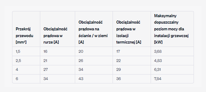Poniżej została przedstawiona przykładowa tabela obciążalności prądowej dla przewodów YDY o przekrojach 1,5 mm², 2,5 mm², 4 mm² i 6 mm