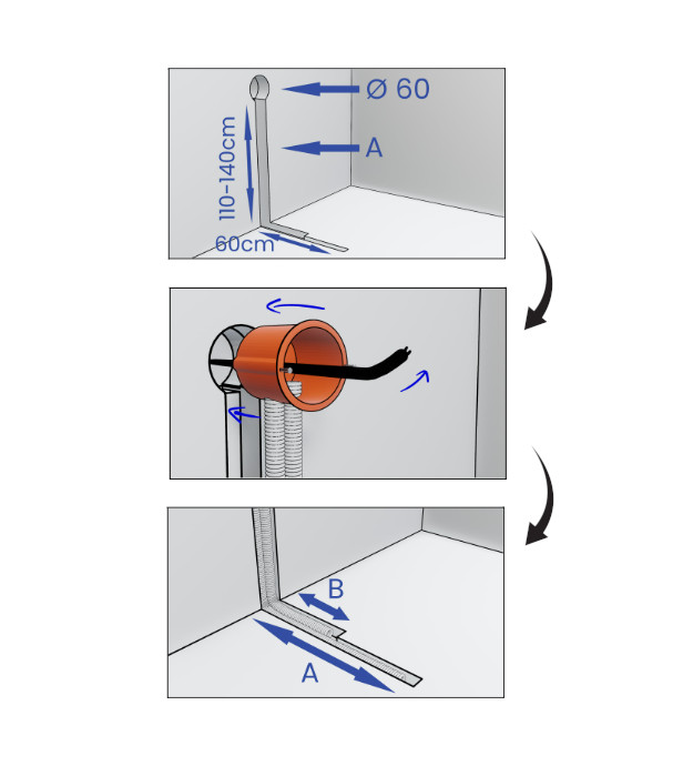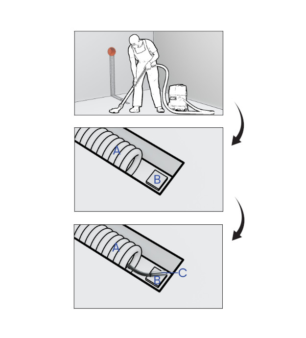 Zamontuj rurki ochronne w podłodze. Rurka ochronna czujnika temperatury powinna mieć długość między 45 cm a 55 cm od ściany (A). Czujnik temperatury powinien znajdować się w miejscu gdzie zostanie zainstalowana folia grzewcza. Umiejscowienie czujnika pod folią grzewczą gwarantuje jego prawidłowe działanie. Druga rurka z przewodem zasilającym folię grzewczą powinna mieć długość od 10 cm do 15 cm (B). Należy zwrócić uwagę czy rurki ochronne nie wystają ponad powierzchnię ściany oraz podłogi.