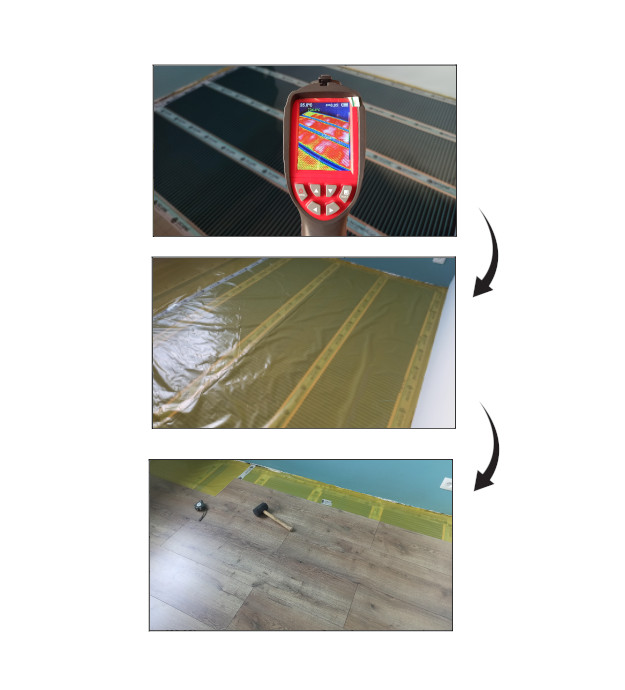 - Przed zakryciem folii grzewczej folią paroizolacyjną uruchamiamy termostat i ustawiamy temperaturę tak, aby system zaczął się nagrzewać, czyli wyższą niż temperatura otoczenia. Następnie pirometrem lub kamerą termowizyjną sprawdzamy wszystkie odcinki folii grzewczej, porównując jak się one nagrzewają i czy cała powierzchnia folii grzewczej podnosi swoją temperaturę.