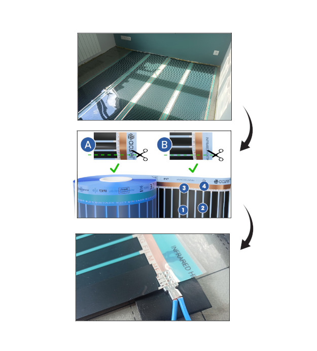 - Rozwiń folię grzewczą Acurel na powierzchni podłoża i dotnij na odpowiedni wymiar w miejscu rozlokowania folii na podłożu w strefach grzewczych wyznaczonych w projekcie. Folię Acurel z serii AC-T można ciąć w każdym miejscu robiąc to równo wzdłuż czarnych pasków. Cięcie A wzdłuż czarnego pasa węglowego B pomiędzy pasami węglowymi. Dokonując cięcia folii na wybrany przez siebie wymiar zachowaj szczególną staranność i precyzję tak, aby miejsce cięcia było pod kątem prostym względem krawędzi bocznej folii. Pamiętaj, aby po cięciu zabezpieczyć krawędzie folii taśmę elektroizolacyjną. Nie zaklejaj jednak na całej szerokości. Wykonaj zabezpieczenie tylko czarnego paska. Miejsca z paskami miedzianymi po obu stronach powinny zostać odsłonięte umożliwiając wykonanie połączenia elektrycznego, które w kolejnym kroku zostanie zaklejone taśmą samowulkanizacyjną.