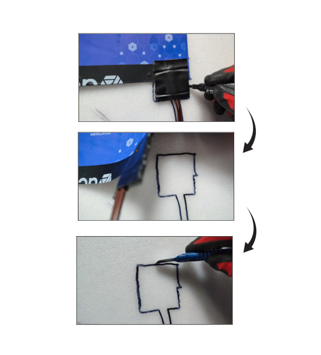 - Należy również pamiętać o wycięciu otworu w miejscu zainstalowania sondy czujnika temperatury tak, aby po położeniu folii grzewczej znajdował się pod nim. Należy również wyciąć otwór w miejscu, w którym zostało poprowadzone zasilanie folii grzewczej. Wycięciu otworów należy wykonać ostrożnie, aby nie uszkodzić czujnika temperatury i przewodów zasilających.