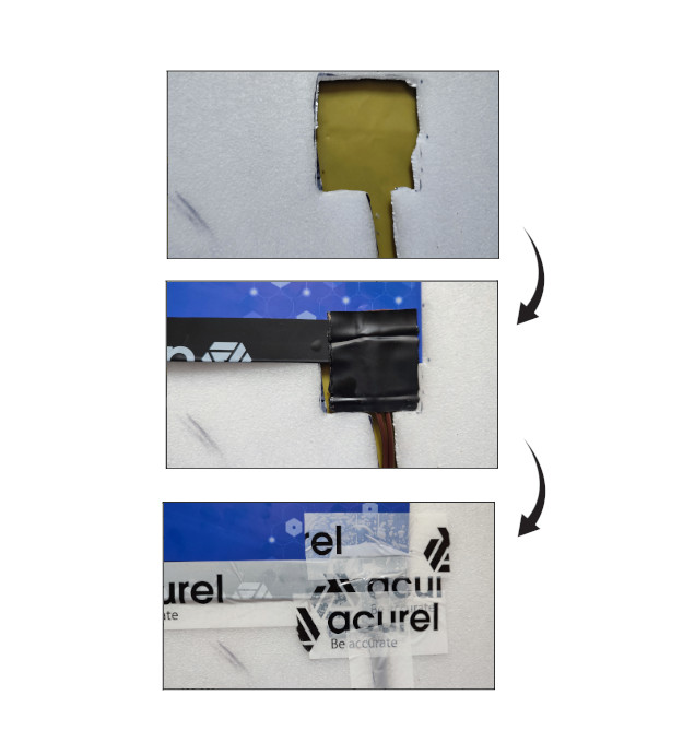 - Wykonany otwór w podkładzie, dla czujnika temperatury podłoża należy precyzyjnie zakleić taśmą samoprzylepną.