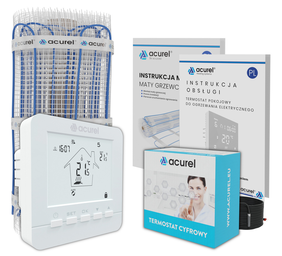 Zestaw z matą grzewczą marki Acurel z seri FT-MAT wraz z akcesoriami montażowymi przeznaczony jest do prawidłowego montażu elektrycznego ogrzewania podłogowego. Zestaw zawiera szczegółową instrukcję montażu, która pozwoli profesjonalnie i bezproblemowo wykonać instalację.