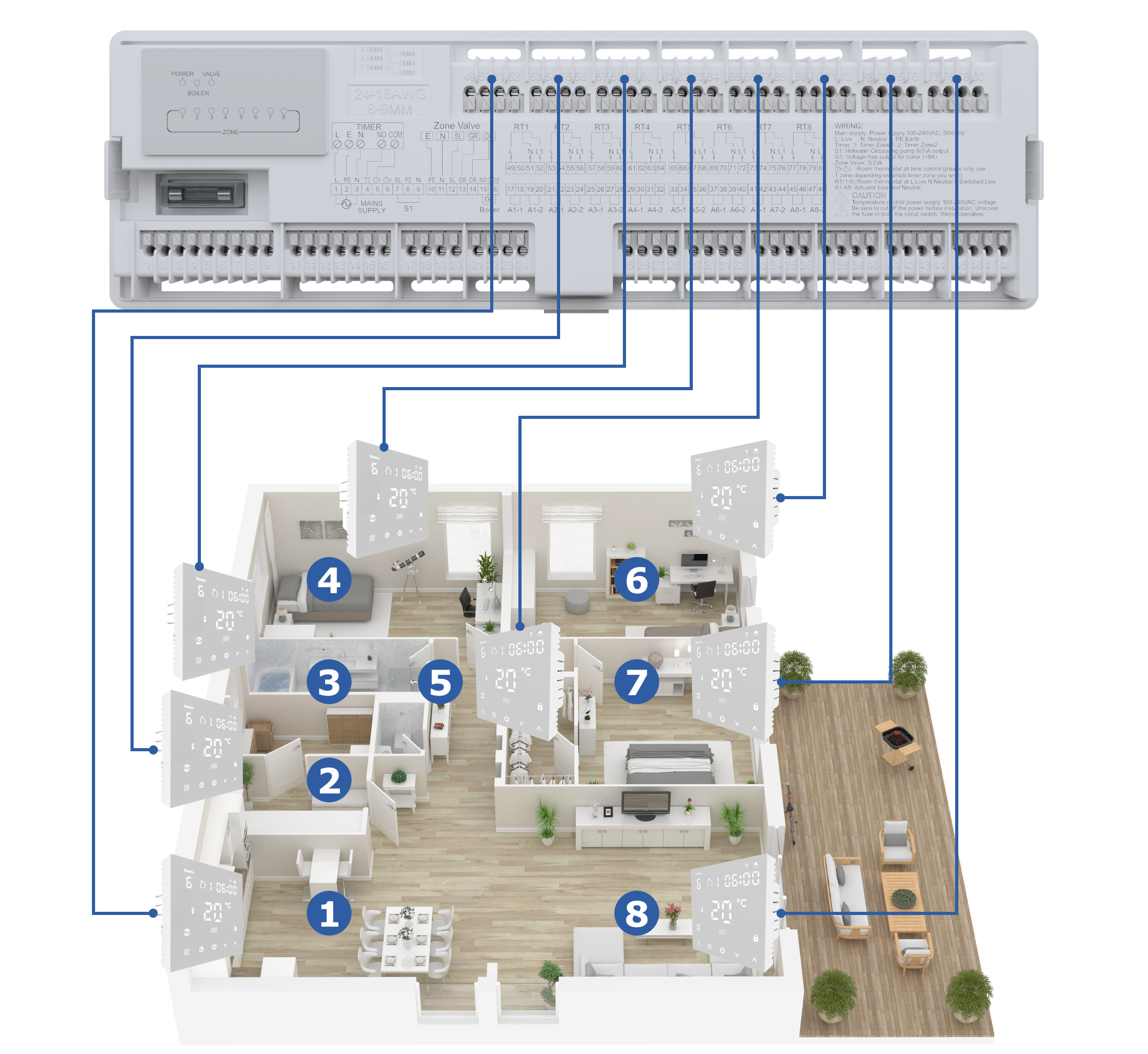 Zastosowanie listwy centralnego ogrzewania jako głównego modułu sterującego w instalacji wodnego ogrzewania podłogowego lub grzejnikowego to rozwiązanie, które łączy funkcjonalność, komfort i efektywność energetyczną. Listwa umożliwia scentralizowane zarządzanie temperaturą w wielu strefach (np. pomieszczeniach), współpracując z przewodowymi termostatami pokojowymi oraz siłownikami termoelektrycznymi montowanymi na rozdzielaczu. Taki układ pozwala na precyzyjne sterowanie przepływem czynnika grzewczego w każdej pętli grzewczej – w zależności od zapotrzebowania cieplnego danego pomieszczenia – co przekłada się na znaczne oszczędności energii oraz wyższy komfort użytkowania. Dodatkowo, listwa może być zintegrowana z urządzeniami grzewczymi (kotłem, pompą, zaworami), umożliwiając ich automatyczne załączanie tylko wtedy, gdy jest to potrzebne. Dzięki intuicyjnemu sposobowi montażu i obsługi, a także szerokiej kompatybilności z różnymi typami termostatów i siłowników, listwa centralna stanowi serce nowoczesnego i zoptymalizowanego systemu ogrzewania domu.
