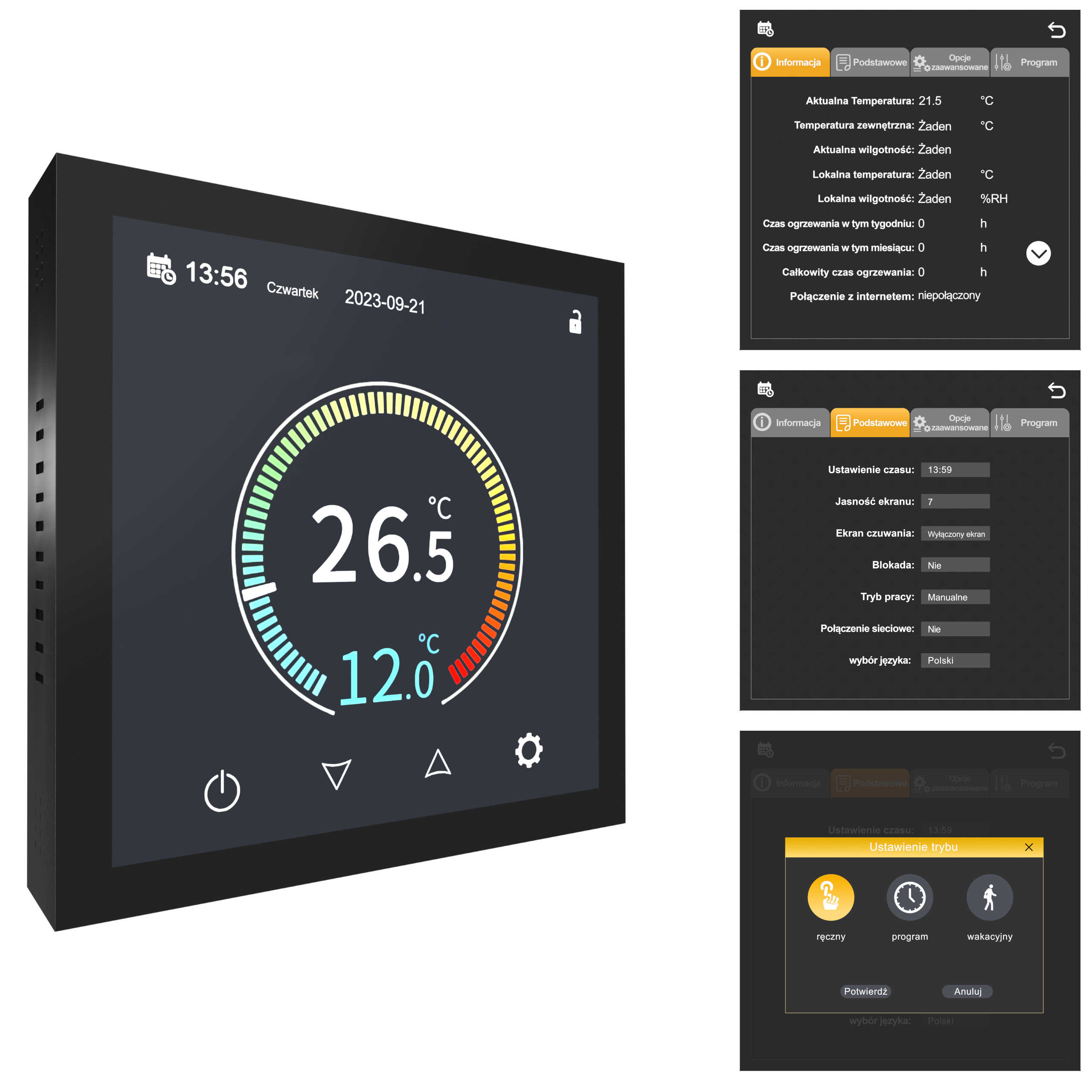 Jednak to nie wszystko. Najnowszy model termostatu Acurel, dostępny w ofercie, charakteryzuje się nie tylko funkcjonalnością, ale także estetyką. Posiada on innowacyjny ekran dotykowy o wysokiej rozdzielczości matrycy TFT IPS o wymiarach 480*480 pikseli. Ten zaawansowany ekran nie tylko prezentuje informacje w sposób czytelny, ale także zapewnia użytkownikowi przyjemne wrażenia wizualne, tworząc nowoczesny i elegancki wygląd termostatu.