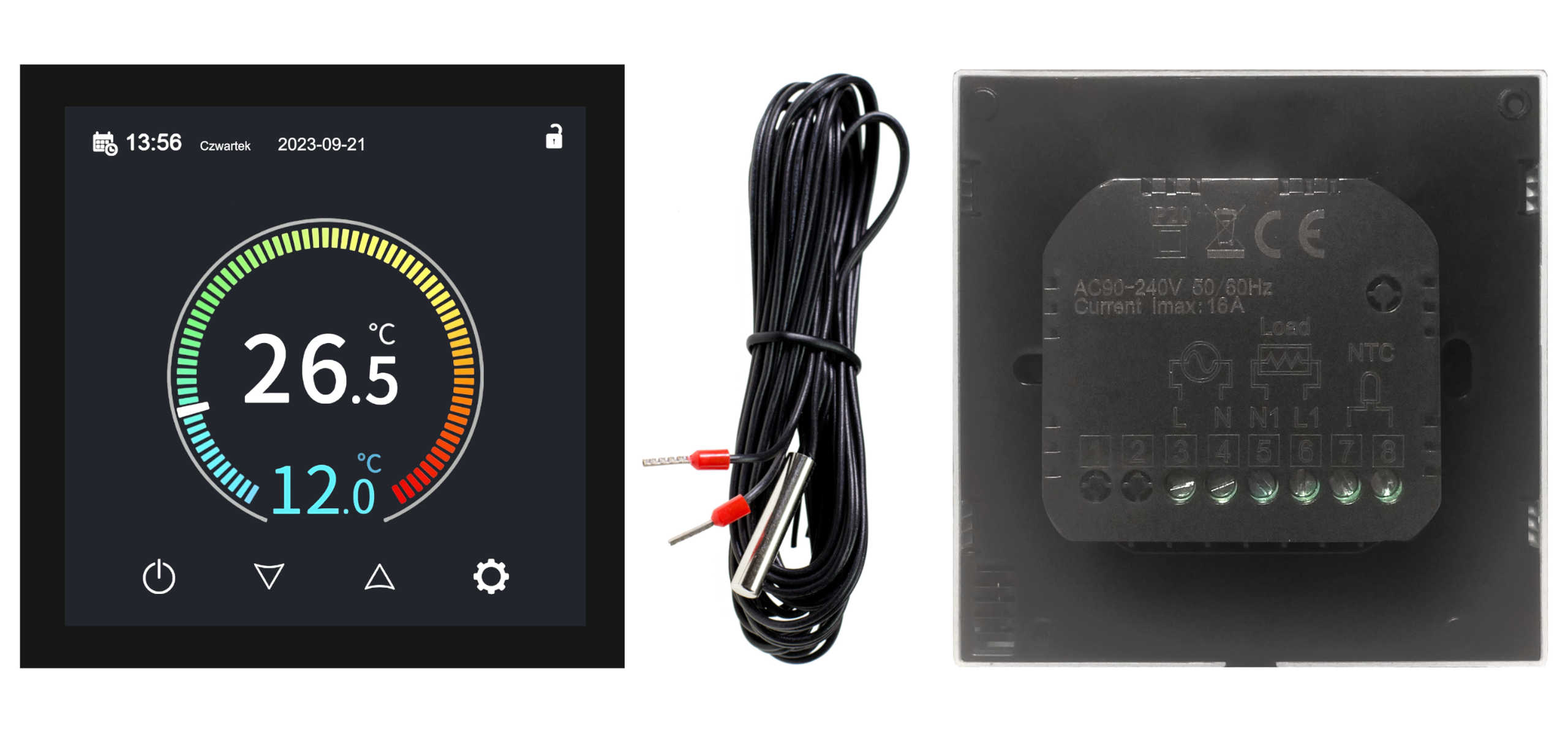 Regulator posiada wbudowany czujnik temperatury powietrza oraz możliwość podłączenia zewnętrznego czujnika temperatury podłogi dołączonego do zestawu. Termostat może kontrolować temperaturę w pomieszczeniu oraz niezależnie kontrolować temperaturę podłogi.