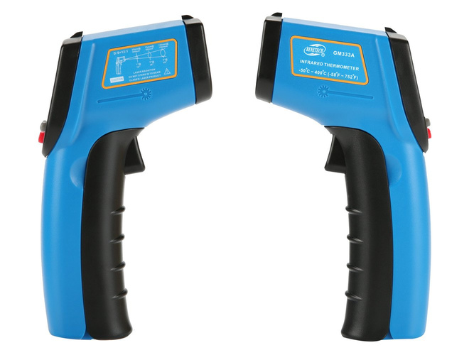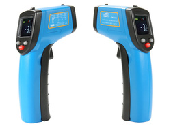 - Pirometr laserowy z kolorowym wyświetlaczem i możliwością ręcznej kalibracji. Urządzenie charakteryzuje się wysokim zakresem temperaturowym (-50 ~ +400°C) oraz precyzją pomiaru, prostą obsługą, a także nowoczesną i ergonomiczną obudową.