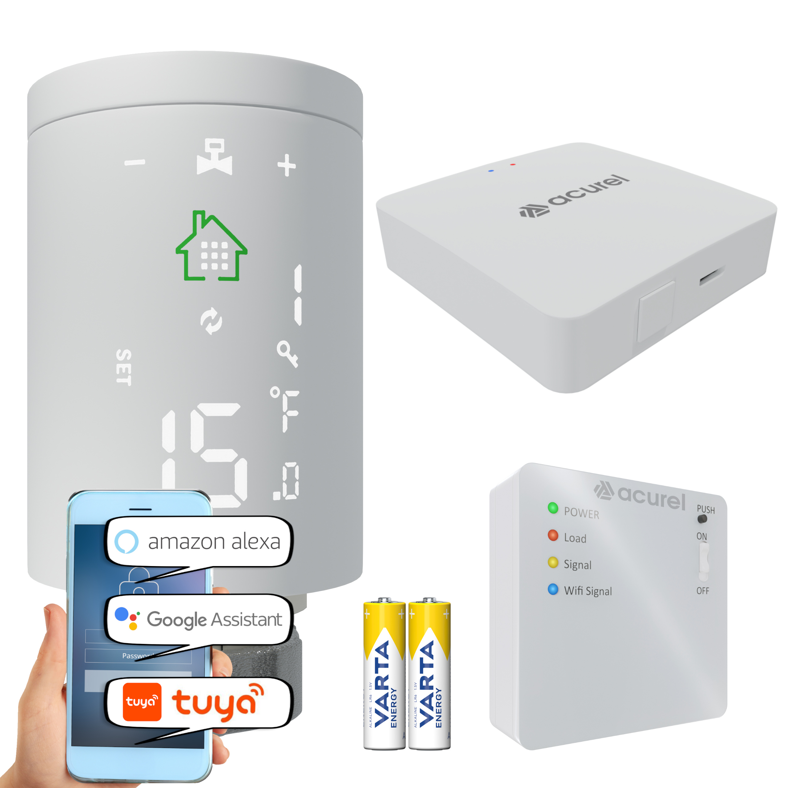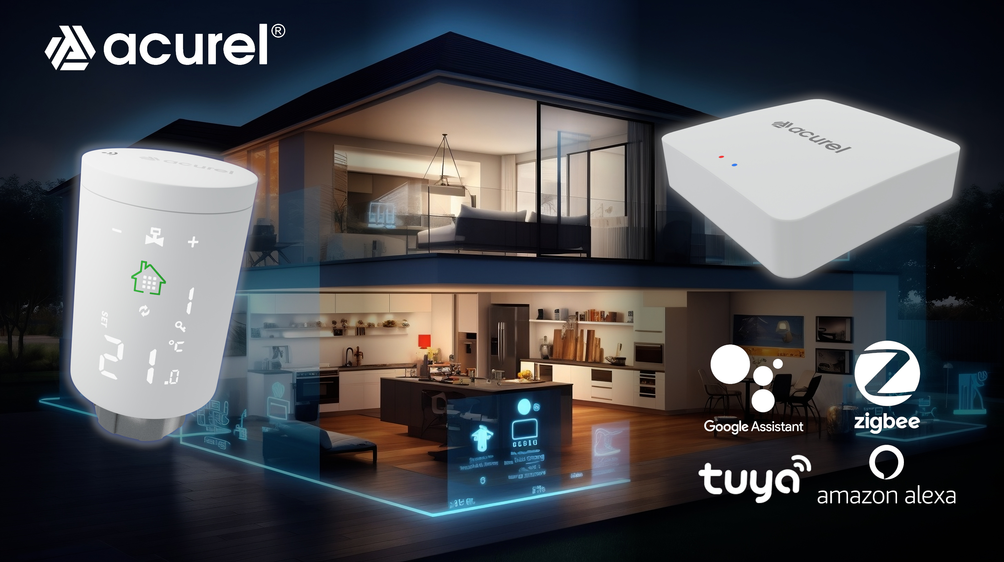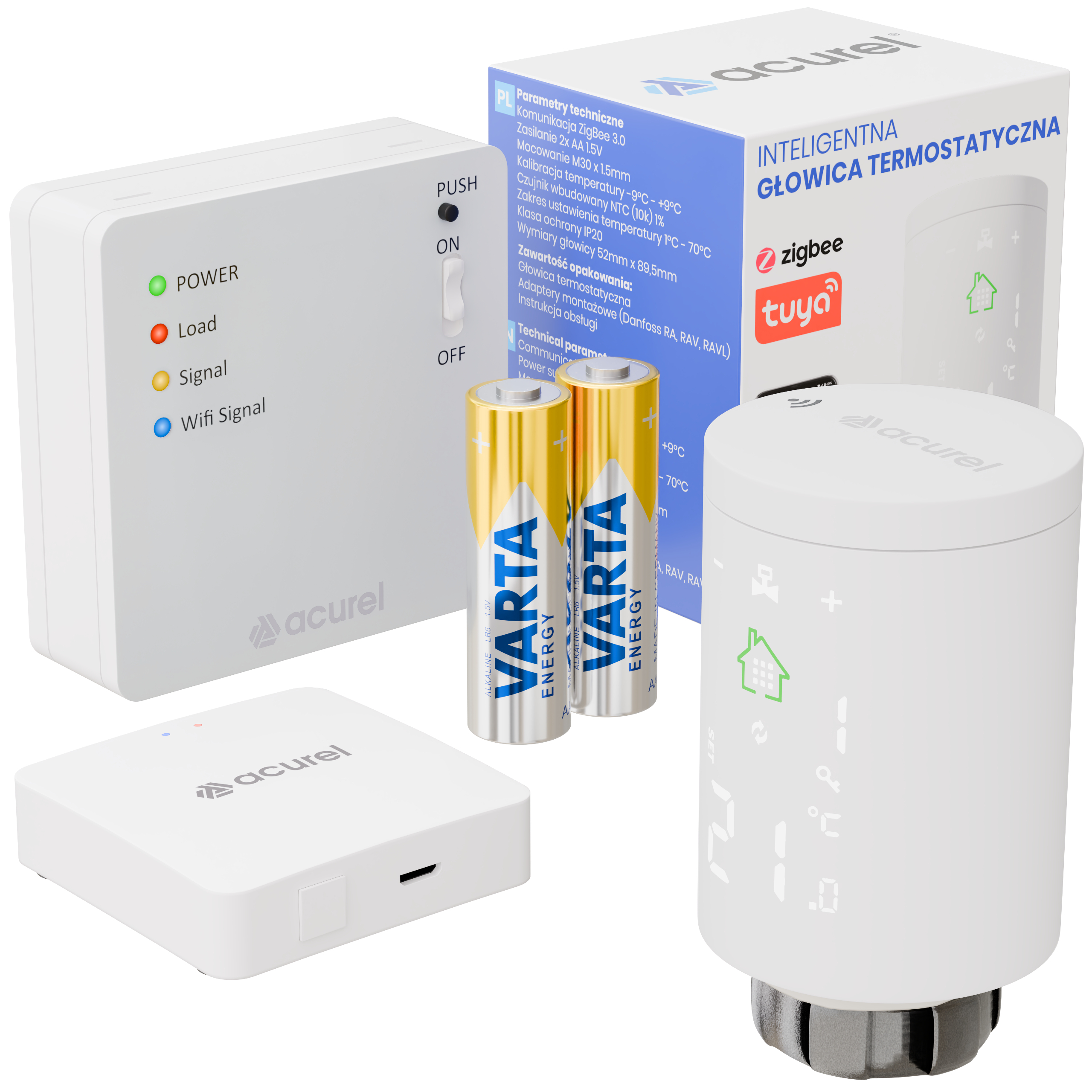 1️⃣ Bramka ZigBee Smart Gateway 3.0 – jest centrum zarządzania systemem, łączącym wszystkie urządzenia grzewcze w jeden ekosystem. Umożliwia sterowanie ogrzewaniem za pomocą aplikacji Tuya, Smart Life oraz asystentów głosowych Google Home i Alexa.